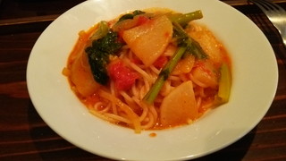 私たちは日替わりパスタの「大根と大和真菜のトマトソースパスタ」を選びました。