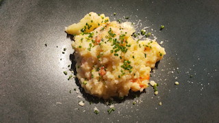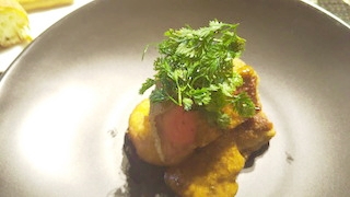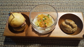いちばん右は、シューの中にフォアグラ入りのアイスが入ったシューアイス。真ん中はカリフラワーの入った寒天のようなものの上に雲丹が乗っています。いちばん左はピンチョス。鴨のローストとカブがサンドされています。どれも普段たべたことのないお料理で、口に入れるたび驚きの連続。