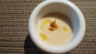 中に菊芋を焼いたものが入っていて、菊芋のチップスがトッッピングされていました。優しい甘さのスープでした。