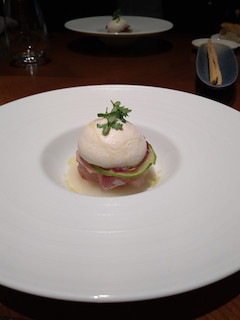 | 前菜です。お魚の上に赤カブのスライス。その上には大根や生クリームを使ったふんわりクリームが乗っています。 |