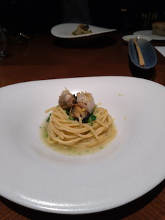 ムール貝やホタテが乗ったスパゲティ。柔らかく茹でられた菜の花とブロッコリーを和えて 、春の美味しさを頂きました。 |