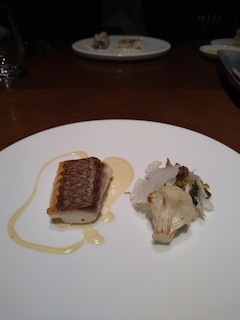 | パリパリに焼かれた鯛の皮、しっとり柔らかくソテーされた身に感動。付け合わせのカリフラワーもきれいで美味しい♪ |