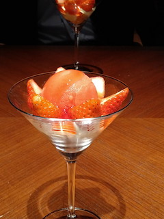 | デザートはイチゴのソルベ。シャンパンとレモンのソースがかかっています。爽やかで、春らしい。イチゴのソルベの下に敷かれたクランブルの甘さと共に味わいました。 |