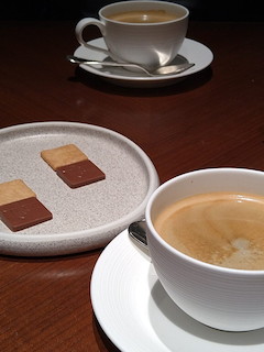 コーヒーとお茶菓子。お茶菓子はピエールエルメのチョコレートとクッキー。香り豊かなコーヒーでお食事はフィナーレを迎えました。 |