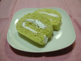 生クリームをたっぷりはさんだロールケーキ。生地が黄色っぽく見えるのは、上白糖を使わずきび砂糖を使ったせいです。