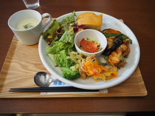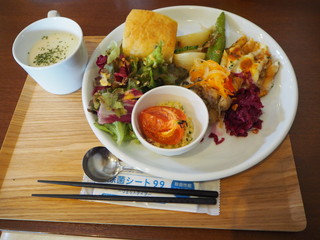 この日は、11:15頃に早めのランチにしました。 「大地のレストラン」では、旬の野菜をふんだんに使ったランチが頂けます。本来、ビュッフェのお店ですが、コロナ禍でもあり、いろいろな惣菜を選んでワンプレートに盛り付けてもらえます。 |
