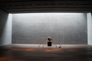 | 楽吉左衛門展への廊下から、入館した池の奥には、こうした水草が植えられています。 | 楽吉左衛門展の入口。 ここは、地下となっており、上から光が差し込んでいます。この上は池底がガラス張りになっており、そこからの光です。水を通しての光で、幻想的な優しい光になっています。 |