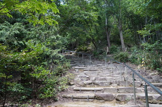 | 観音正寺は山寺で標高432.9メートルの繖山の中腹にあります。お寺への参道は3つあり、表参道で有料の山道で中腹の駐車場まで登り、そこから440段の石段を登ります。正面からは、1200段の石段を登ります。裏参道もあります。 | 中腹の駐車場から440段の石段は不揃いでありやぶ蚊も多く、かなりしんどい参道です。 |