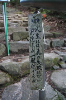 | 石段の途中には、このような札が一定間隔に20枚ほどあり、この内容が、なかなか良いものです。読みながら登りますと440段も苦にならない?ですね。 | そして、お寺の境内の到着。素晴らしい景色で、守山、草津まで見渡せます。 |