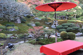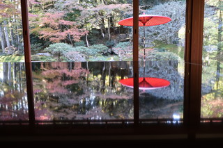 国指定の名勝庭園を背景に、二階と一階に置かれた鏡面の座卓のリフレクションです。見ごたえ十分。 思うような構図の写真がとれませんでしたが。また、勉強したいと思います。 |