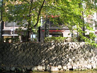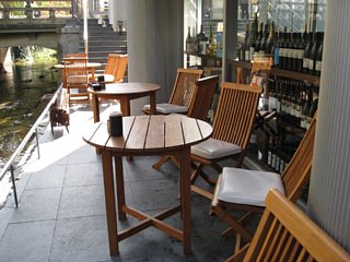 席から見た景色。小さな川を挟んで向こうの通りを行きかう人たちを眺めながらのランチです。
