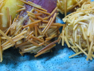 さつまいもを適当な大きさに切って、水にさらしてから水気を拭き小麦粉・てんさい糖・塩・水で作った衣にくぐらせます。そこに細かく砕いた素麺をまぶして160℃の油でじっくり揚げます。お好みでシナモンをふりかけていただきます。いが栗に見えます・・・?