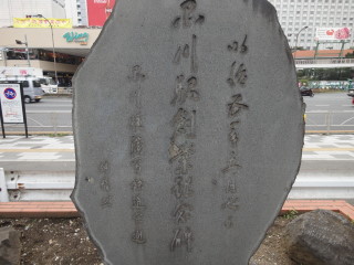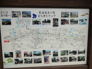 | 旧東海道の品川宿の入り口には、こんな案内板があります。 | 現在の第一京浜道路沿いに歩きます。JR品川駅のまえには、横浜ー新橋間に鉄道が開通したときに品川駅もできました。そんな記念碑がありました。 |