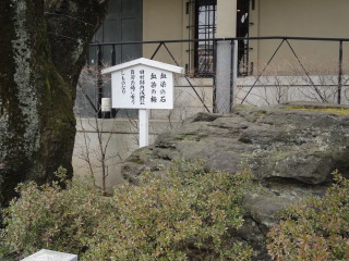 | 山門横には大石内蔵助の銅像があります。 | 浅野内匠頭が田村右京大夫邸の庭先で切腹した際に、その血がかかったと伝えられている梅と石です。 |