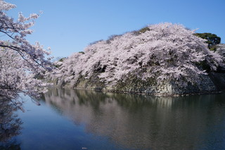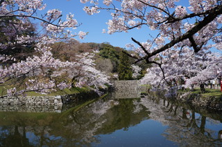 彦根城の桜 外堀、内堀とお城には桜が似合います。 掘りの水面に映る桜は違った姿を見せます。 |