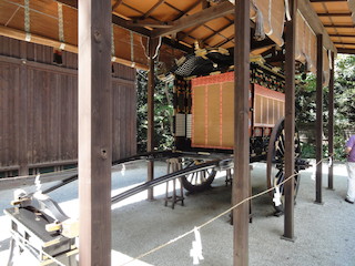 | これが言社で、みなさん、生まれの干支にお参りされていました。 | これは、特別拝観で入った「大炊殿」の横にあった牛舎。平安時代の風景がよみがえってきますね。 |