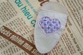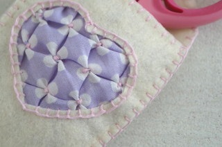 スモッキングという手法でいくつか水玉をお花に変身させた布を、ハートの形にくりぬいたフェルトから覗かせます。