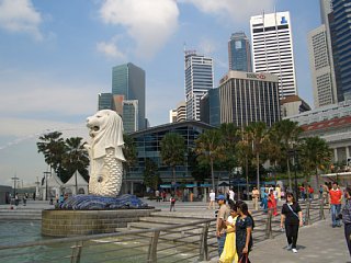 ![]() 写真の奥に 2匹目のマーライオンが見えます・・。 下の写真が、そのマーライオン とってもちっちゃい。 しかし、バックのビル群がシンガポールらしい。 見えるのは金融街です。 |