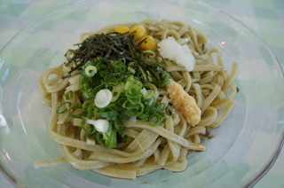 | 公園内はこんな感じで、植物公園らしく、楽しめます。また、ロータス館には、温室があります。このほか、お土産物、お食事どころがあります。 | これは、食堂でいただきました、「冷やし蓮うどん」です。黄色い豆のようなものが見えますが、これが蓮の実の甘露煮だそうです。 |