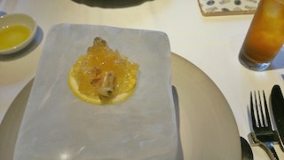 あわびの前菜は、大きな氷の器に乗って。冷たいジュレが蒸し暑い中歩いてきた体をすっと冷ましてくれました。
