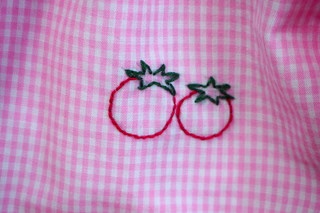 左胸のあたりに、Yちゃんの好きなミニトマトをふたつ刺しゅうしました。