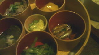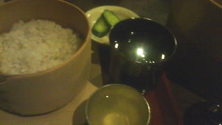 | ・麦入りのごはん、食前梅ゼリー(アルコールは入っていません)、湯葉のお吸い物、きゅうりのお漬物。 梅ゼリーにはスプーンがついていなかったんですけど、まるで飲み物のようにツルッと口へ流れる なめらかなゼリーでした。冷たいものがす〜っと体にしみ込み、口の中もさっぱり。