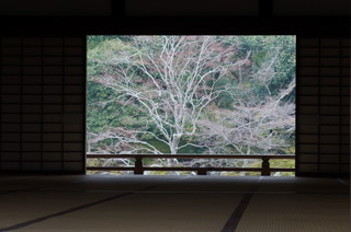 | 大方丈の庭。 | 大方丈から曹源池庭園が望めます。まるで窓越しの額に入った庭のようです。 |