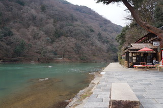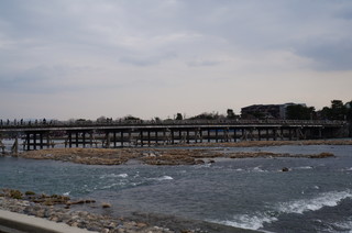 | 嵐山の渡月橋。あの大洪水の傷跡からの復興したように見えますが、橋には多くの傷跡がありました。 | 嵐山の桂川。渡月橋の上流で、大洪水から復興し元の風景に見えます。 |