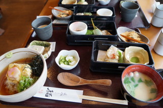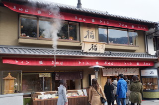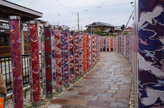 | 嵐電 嵐山駅にある、友禅の光林。ずらりと並ぶポールに、色鮮やかな京友禅がセットされています。とてもキレイでした。夜はこのポールにライトが灯されるようです。もっとキレイだろうなぁ・・・。次は夜に訪れたいです。 | お昼は、嵐電 嵐山駅のすぐ近く「嵯峨とうふ 稲」さんでいただきました。 |