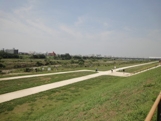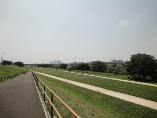 | 多摩川までやってきました。 | 堤防沿いは、風が通り、なんだかよい感じです。 |