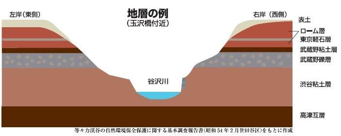 | 等々力渓谷〜二子玉川 (2017年7月9日 現在) by yama 東京の夏は暑い! そこで、東京23区内で唯一の渓谷である等々力渓谷に行ってきました。 午前中に行ったせいかもしれませんが、本当に涼しい! 2−3度は低い気温に感じました。 ここは、武蔵野台地の南端にあたり、この台地面を侵食し開成した渓谷になります。 実際、下図のような地層を観ることができます。 ![]() http://www.city.setagaya.lg.jp/shisetsu/1217/1271/d00004247.html |