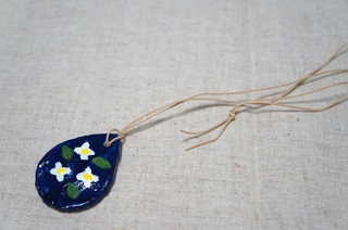 ネックレストップは、しずく型で白いお花と緑の葉っぱの柄をフリーハンドで。穴を開けてコットンのコードを通してネックレスにしました。