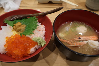 | きっときと市場の「湊寿司」さんで、富山丼をいただきました。白エビがたっぷりのった一品です。おいしかった!! |