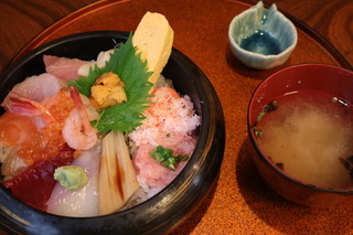 最後は、近江町市場で昼食です。 観光客で大賑わいでした、新鮮な魚介類がいっぱいです。 昼食は、近江町食堂の名物海鮮丼です。著名人も多く訪れるこのお店、、新鮮な海鮮丼は最高です! |