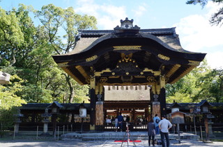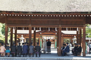 秀吉が亡くなった翌年の1599年(慶長4年)、秀吉はその遺言により東山の阿弥陀ヶ峰の山頂に葬られました。その中腹に秀吉を神様として祀る神社が創建されたのが、豊国神社の始まりです。そして、後陽成天皇から「豊国大明神」の神号を賜りました。 しかし1615年(慶長20年)、大坂夏の陣で豊臣家が敗れると、その後政権を握った徳川家康の命で神号は廃され、神社の社領は幕府が没収となった。その後、1868年(明治元年)、明治維新により250年近く続いた江戸幕府は倒れ、日本は新しい時代を迎えていました。その折に明治天皇が、神社の復興と再建を命じます。 この日はちょうど結婚式が行われていました。 |