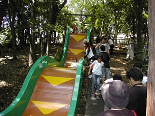 <場所> 横浜市緑区長津田4191 ・「東急田園都市線 すずかけ台駅」より約1,200m ・「東急田園都市線 つくしの駅」より約1,200m ・「JR横浜線 / 東急田園都市線 長津田駅より約1,500m ・「東名高速道路 横浜町田IC」より車で約5分 <こんなところ> アスレチックHP : http://www.tsukushino.co.jp/index.html 入場料 : 大人 800円、中高学生 700円、小学生幼児 500円 駐車場 : 無料 しかし 休日には結構いっぱいになります。 ここへ入るために 246号は渋滞になったりもします。 午前中には 入りたいものです。 食事情報 : お弁当もちが正解です。ほとんど そうされていました。 園内にはレストラン等はありません。 ![]() これも 90度滑り台の一種 ![]() 池ポチャコース 桶こぎが人気 ![]() |