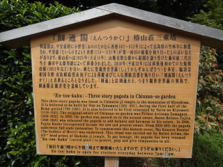 | 圓通閣は、平安後期に広島県の竹林時で創建され、平清盛によって第一回目の修復がされたとのこと。この地には、大正14年に山縣有朋から譲り受けた藤田財閥が移築したとのこと。 | |