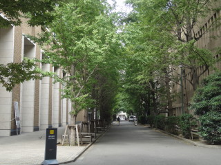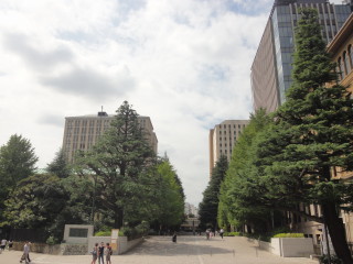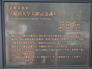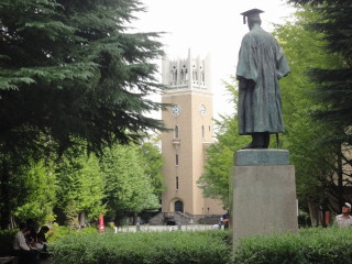 | 早稲田大学にやってきました。北門から正門に向かいます。イチョウ並木がいいですね。 | 大隈重信の像の先には、早稲田大学のシンボルである講堂が見えます。 |