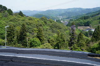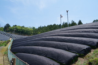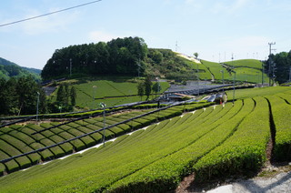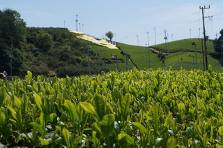 | お茶畑が広がる、なんとも気持ちの良い風景です。 | 黒いネットをかぶった新芽は、少ない日光で光合成しようとするため、新芽の栄養成分である、テアニンというアミノ酸や、葉緑素であるクロロフィルが豊富に蓄えられ、「かぶせ煎茶」特有の甘みとコクの濃い味が出るそうです。 |