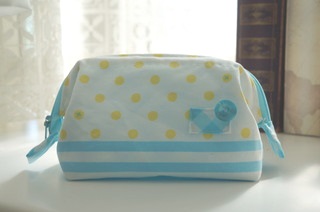 レモンイエローのドットとブルーのストライプが夏らしい帆布が表側。