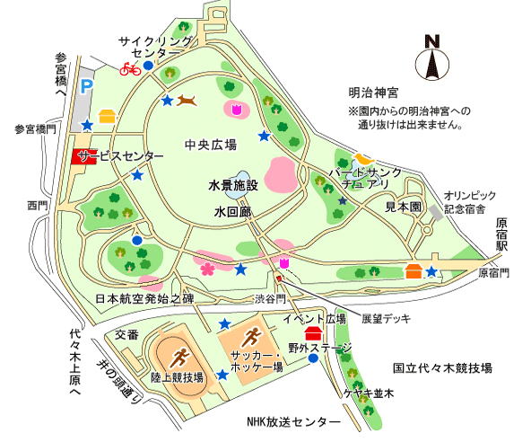 | 代々木公園 (2017年9月3日 現在) by yama 代々木公園は、23区内の都立公園の中で五番目に広い公園です。道路を挟んで森林公園側と、陸上競技場、野外ステージなどの地区と分かれています。ここは、かつて陸軍代々木練兵場で、戦後は米軍の宿舎敷地・ワシントンハイツとなり、東京オリンピックでは、選手村となっており、その後に公園として整備されました、隣接する明治神宮の木々と共に緑濃い森を作っており、都民の憩いの場になっています。多くの家族ずれや、ランナーが楽しんでました。 http://www.tokyo-park.or.jp/park/format/about039.html ![]() <出所:東京都公園協会web> |