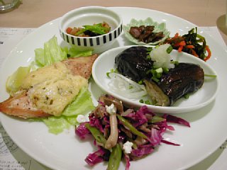 なすのはさみ揚げ・サーモンの香り焼き・八目豆・紫キャベツときのこのサラダ・すき昆布とツナの炒めサラダ。それにおつけものがついてました。週ごとにメニューが変わるんですね〜。いつ行ってもその季節に合ったバラエティー豊かなランチがいただけるのですね。今週のランチのなかではなすのはさみ揚げが一番のお気に入りでした。これは栗原さんの著書「すてきレシピ12」に載っているそうです。ほんとにおいしかったのでうちでも作ってみたい!